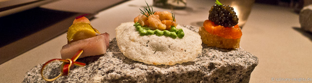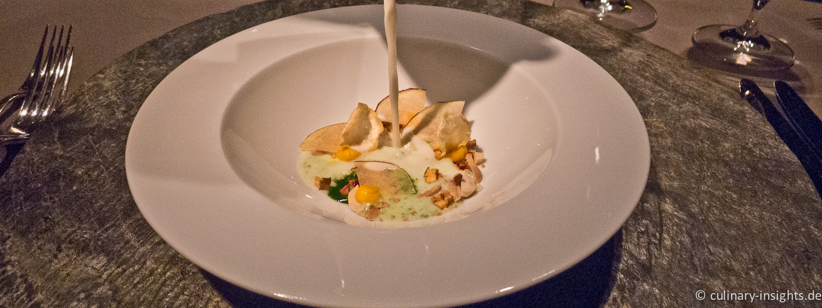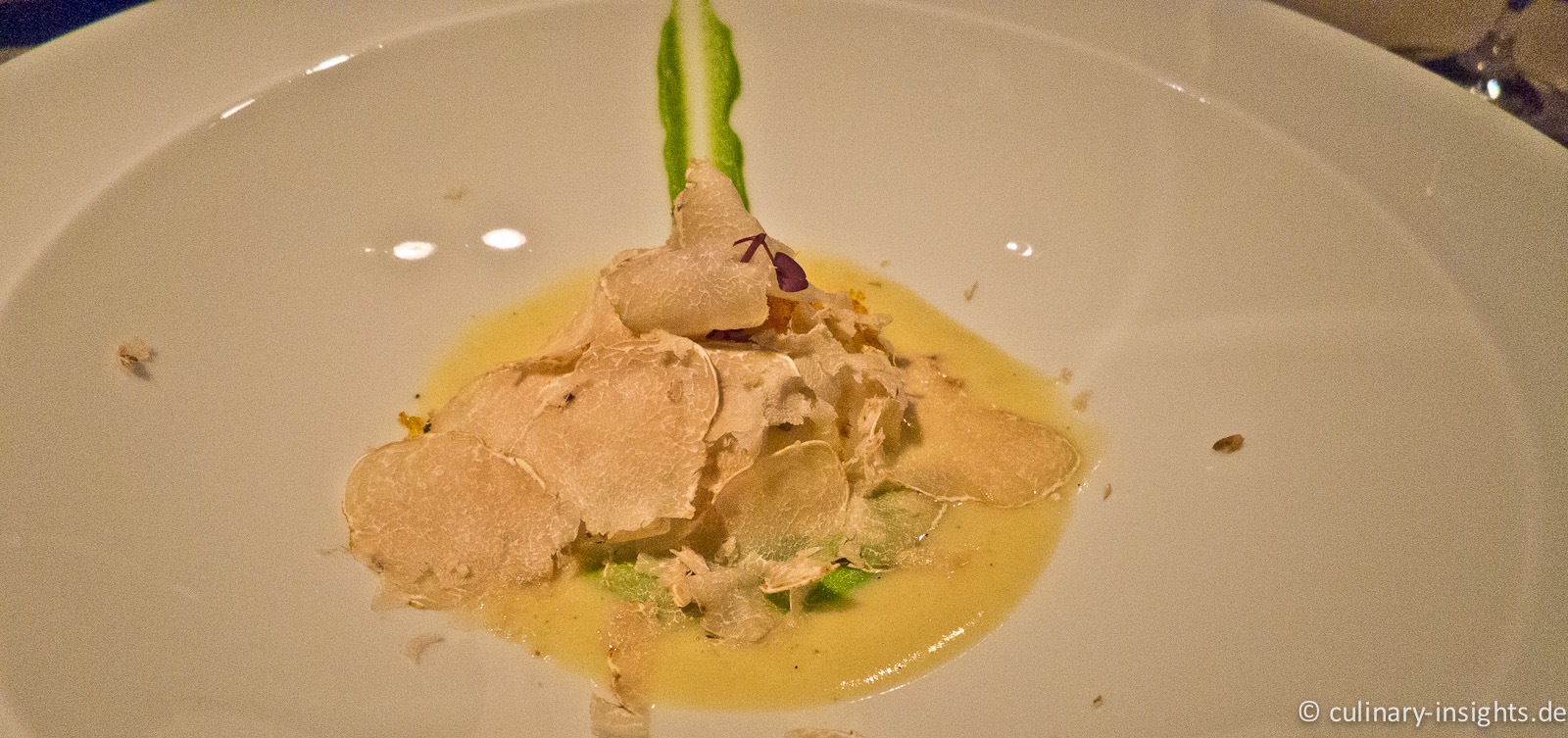 A parade of nibbles was served on a stone that together with the granite underplate reminded me a bit of some Scandinavian restaurants… Anyway, the regional crabs from Büsum were delicate and fresh, although the cracker in combination with the very good salmon was not crispy enough. The matjes (salted herring) was to the point and quite yummy.